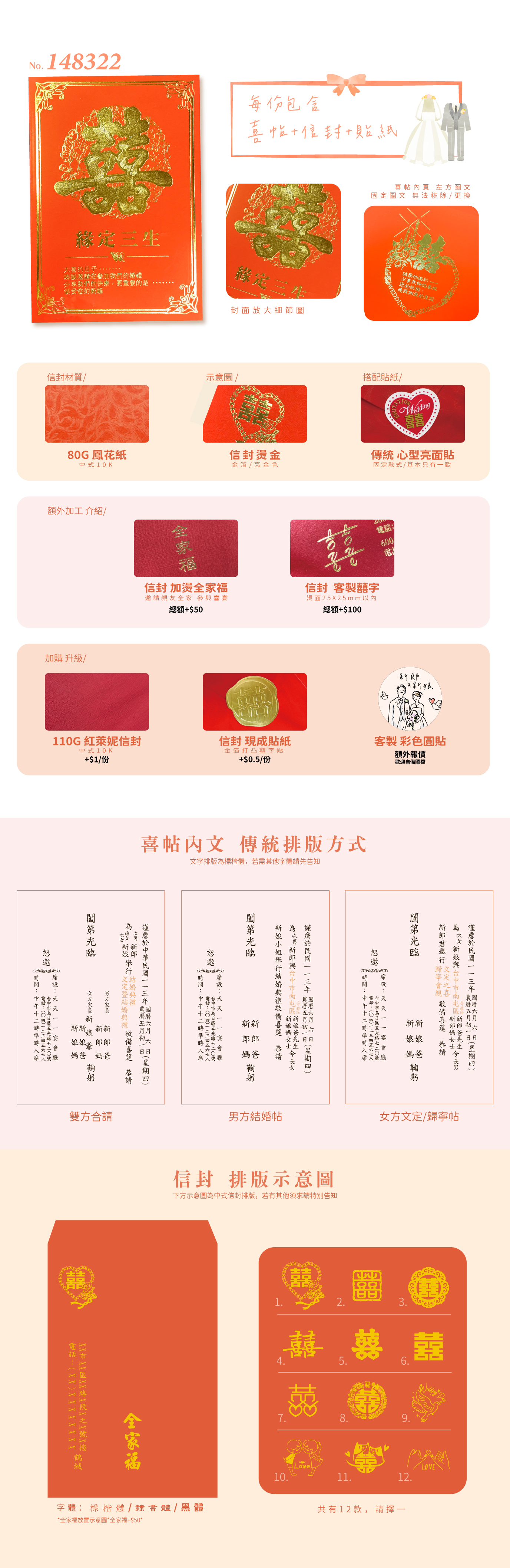 | 喜帖材質.加工 | 250G傳統紅卡紙/燙金/左翻 *喜帖不會折後寄出,將攤平寄送* |